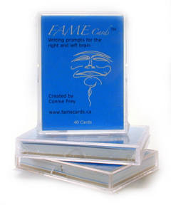 After years of facilitating others' creativity, through one-on-one mentoring, workshops and retreats, cross-disciplinary specialist Connie Frey developed a reliable creative stimulus for writers, teachers and creators of all ages. In quicksilver fashion the FAME prompts ~ Focus, Awareness, Momentum, Expression ~ rouse creative productivity. Spontaneity and imaginative responses occur naturally. Order the pocket-size muse for solo or group play, or contact Connie for bulks orders. Have fun with your creativity!